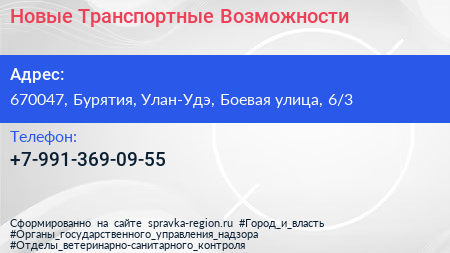 Новые Транспортные Возможности по адресу 670047, Бурятия, Улан-Удэ, Боевая улица, 6/3 в дальнейшем Организация, размещена в следующих категориях:
