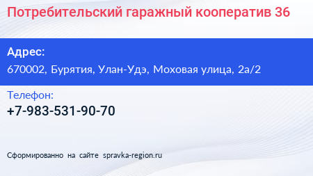 Потребительский гаражный кооператив №36 по адресу 670002, Бурятия, Улан-Удэ, Моховая улица, 2а/2 в дальнейшем Организация, размещена в следующих категориях: