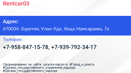 Rentcar03 по адресу 670034, Бурятия, Улан-Удэ, Хоца Намсараева, 7а в дальнейшем Организация, размещена в следующих категориях: