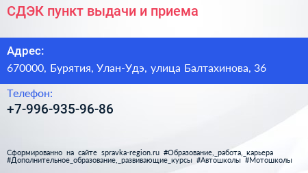 СДЭК, пункт выдачи и приема по адресу 670000, Бурятия, Улан-Удэ, улица Балтахинова, 36 в дальнейшем Организация, размещена в следующих категориях: