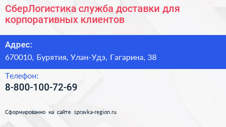 СберЛогистика, служба доставки для корпоративных клиентов по адресу 670010, Бурятия, Улан-Удэ, Гагарина, 38 в дальнейшем Организация, размещена в следующих категориях: