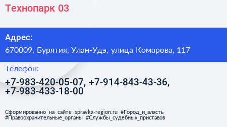 Технопарк 03 по адресу 670009, Бурятия, Улан-Удэ, улица Комарова, 117 в дальнейшем Организация, размещена в следующих категориях: