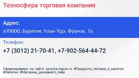 Техносфера, торговая компания по адресу 670000, Бурятия, Улан-Удэ, Фрунзе, 7а в дальнейшем Организация, размещена в следующих категориях: