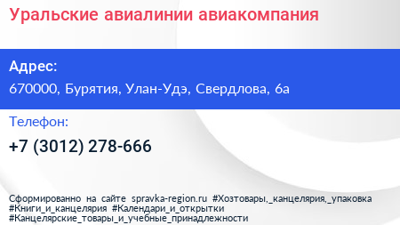 Уральские авиалинии, авиакомпания по адресу 670000, Бурятия, Улан-Удэ, Свердлова, 6а в дальнейшем Организация, размещена в следующих категориях: