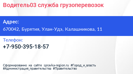 Водитель03, служба грузоперевозок по адресу 670042, Бурятия, Улан-Удэ, Калашникова, 11 в дальнейшем Организация, размещена в следующих категориях: