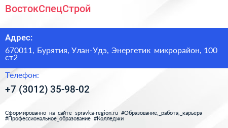 ВостокСпецСтрой по адресу 670011, Бурятия, Улан-Удэ, Энергетик микрорайон, 100 ст2 в дальнейшем Организация, размещена в следующих категориях: