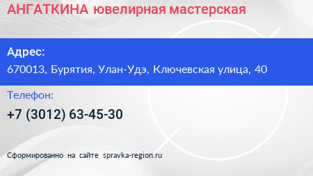 АНГАТКИНА, ювелирная мастерская по адресу 670013, Бурятия, Улан-Удэ, Ключевская улица, 40 в дальнейшем Организация, размещена в следующих категориях: