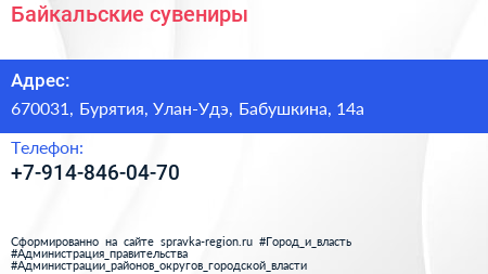 Байкальские сувениры по адресу 670031, Бурятия, Улан-Удэ, Бабушкина, 14а в дальнейшем Организация, размещена в следующих категориях: