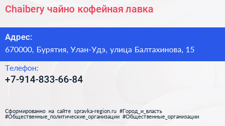 Chaibery, чайно-кофейная лавка по адресу 670000, Бурятия, Улан-Удэ, улица Балтахинова, 15 в дальнейшем Организация, размещена в следующих категориях: