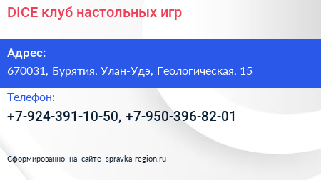 DICE, клуб настольных игр по адресу 670031, Бурятия, Улан-Удэ, Геологическая, 15 в дальнейшем Организация, размещена в следующих категориях: