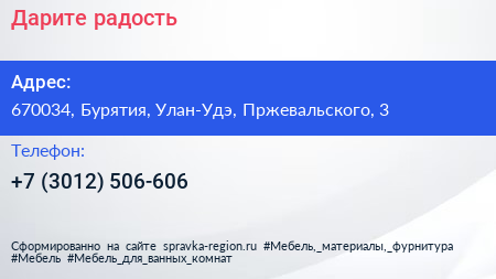 Дарите радость! по адресу 670034, Бурятия, Улан-Удэ, Пржевальского, 3 в дальнейшем Организация, размещена в следующих категориях: