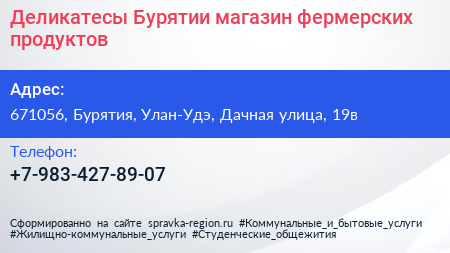 Деликатесы Бурятии, магазин фермерских продуктов по адресу 671056, Бурятия, Улан-Удэ, Дачная улица, 19в в дальнейшем Организация, размещена в следующих категориях:
