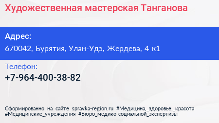 Художественная мастерская Танганова по адресу 670042, Бурятия, Улан-Удэ, Жердева, 4 к1 в дальнейшем Организация, размещена в следующих категориях: