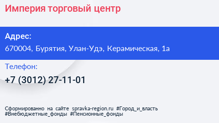 Империя, торговый центр по адресу 670004, Бурятия, Улан-Удэ, Керамическая, 1а в дальнейшем Организация, размещена в следующих категориях:
