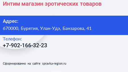 Интим, магазин эротических товаров по адресу 670000, Бурятия, Улан-Удэ, Банзарова, 41 в дальнейшем Организация, размещена в следующих категориях: