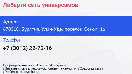 Либерти, сеть универсамов по адресу 670018, Бурятия, Улан-Удэ, посёлок Сокол, 1а в дальнейшем Организация, размещена в следующих категориях: