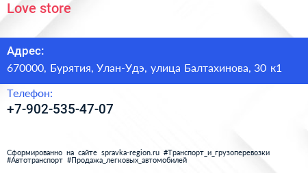 Love store по адресу 670000, Бурятия, Улан-Удэ, улица Балтахинова, 30 к1 в дальнейшем Организация, размещена в следующих категориях: