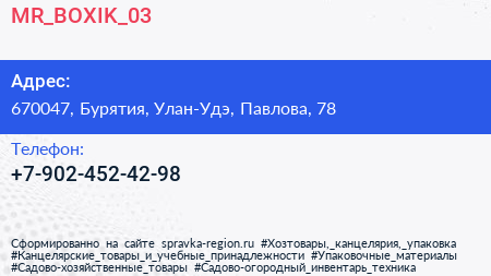 MR_BOXIK_03 по адресу 670047, Бурятия, Улан-Удэ, Павлова, 78 в дальнейшем Организация, размещена в следующих категориях: