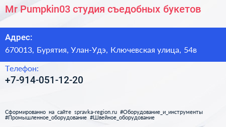 Mr.Pumpkin03, студия съедобных букетов по адресу 670013, Бурятия, Улан-Удэ, Ключевская улица, 54в в дальнейшем Организация, размещена в следующих категориях: