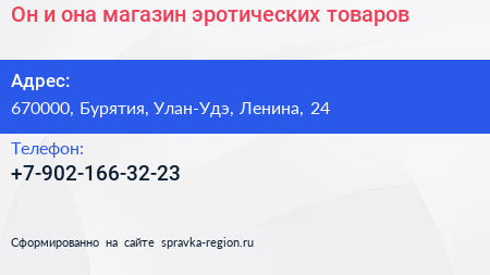 Он и она, магазин эротических товаров по адресу 670000, Бурятия, Улан-Удэ, Ленина, 24 в дальнейшем Организация, размещена в следующих категориях: