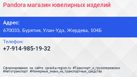 Pandora, магазин ювелирных изделий по адресу 670033, Бурятия, Улан-Удэ, Жердева, 104Б в дальнейшем Организация, размещена в следующих категориях: