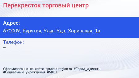 Перекресток, торговый центр по адресу 670009, Бурятия, Улан-Удэ, Хоринская, 1в в дальнейшем Организация, размещена в следующих категориях: