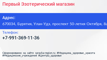 Первый Эзотерический, магазин по адресу 670034, Бурятия, Улан-Удэ, проспект 50-летия Октября, 8а в дальнейшем Организация, размещена в следующих категориях: