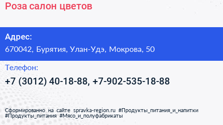 Роза, салон цветов по адресу 670042, Бурятия, Улан-Удэ, Мокрова, 50 в дальнейшем Организация, размещена в следующих категориях: