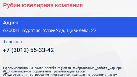 Рубин, ювелирная компания по адресу 670034, Бурятия, Улан-Удэ, Цивилева, 27 в дальнейшем Организация, размещена в следующих категориях: