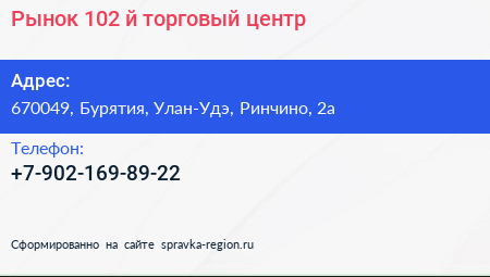 Рынок 102-й, торговый центр по адресу 670049, Бурятия, Улан-Удэ, Ринчино, 2а в дальнейшем Организация, размещена в следующих категориях: