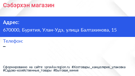Сэбэрхэн, магазин по адресу 670000, Бурятия, Улан-Удэ, улица Балтахинова, 15 в дальнейшем Организация, размещена в следующих категориях: