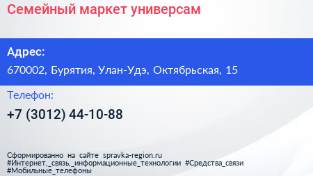 Семейный маркет, универсам по адресу 670002, Бурятия, Улан-Удэ, Октябрьская, 15 в дальнейшем Организация, размещена в следующих категориях: