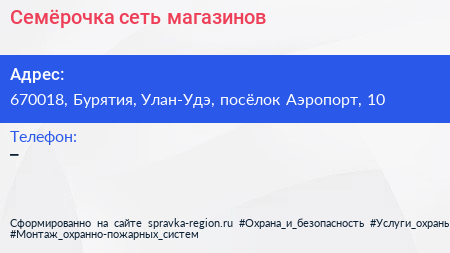 Семёрочка, сеть магазинов по адресу 670018, Бурятия, Улан-Удэ, посёлок Аэропорт, 10 в дальнейшем Организация, размещена в следующих категориях:
