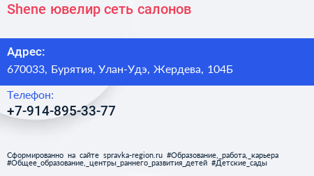 Shene ювелир, сеть салонов по адресу 670033, Бурятия, Улан-Удэ, Жердева, 104Б в дальнейшем Организация, размещена в следующих категориях:
