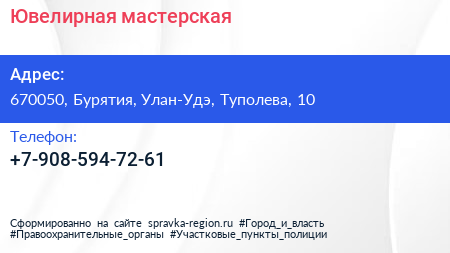 Ювелирная мастерская по адресу 670050, Бурятия, Улан-Удэ, Туполева, 10 в дальнейшем Организация, размещена в следующих категориях: