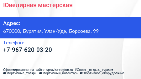 Ювелирная мастерская по адресу 670000, Бурятия, Улан-Удэ, Борсоева, 99 в дальнейшем Организация, размещена в следующих категориях: