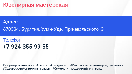 Ювелирная мастерская по адресу 670034, Бурятия, Улан-Удэ, Пржевальского, 3 в дальнейшем Организация, размещена в следующих категориях: