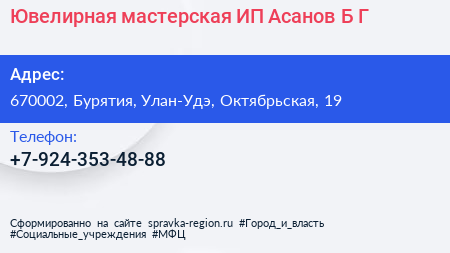 Ювелирная мастерская, ИП Асанов Б.Г. по адресу 670002, Бурятия, Улан-Удэ, Октябрьская, 19 в дальнейшем Организация, размещена в следующих категориях: