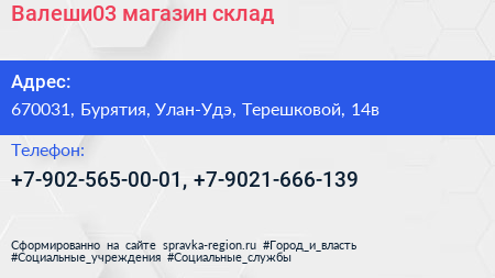 Валеши03, магазин-склад по адресу 670031, Бурятия, Улан-Удэ, Терешковой, 14в в дальнейшем Организация, размещена в следующих категориях: