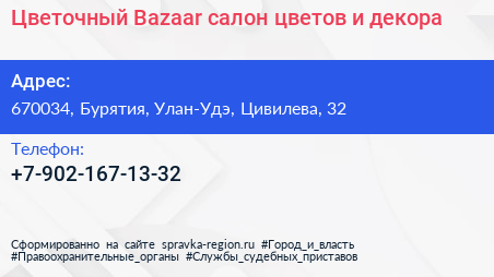 Цветочный Bazaar, салон цветов и декора по адресу 670034, Бурятия, Улан-Удэ, Цивилева, 32 в дальнейшем Организация, размещена в следующих категориях: