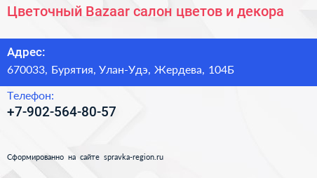 Цветочный Bazaar, салон цветов и декора по адресу 670033, Бурятия, Улан-Удэ, Жердева, 104Б в дальнейшем Организация, размещена в следующих категориях: