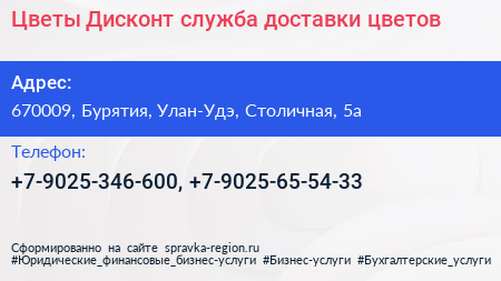 Цветы Дисконт, служба доставки цветов по адресу 670009, Бурятия, Улан-Удэ, Столичная, 5а в дальнейшем Организация, размещена в следующих категориях: