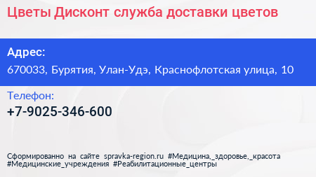 Цветы Дисконт, служба доставки цветов по адресу 670033, Бурятия, Улан-Удэ, Краснофлотская улица, 10 в дальнейшем Организация, размещена в следующих категориях: