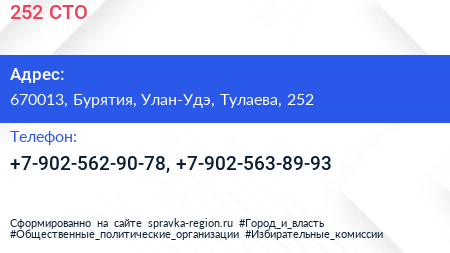 252, СТО по адресу 670013, Бурятия, Улан-Удэ, Тулаева, 252 в дальнейшем Организация, размещена в следующих категориях: