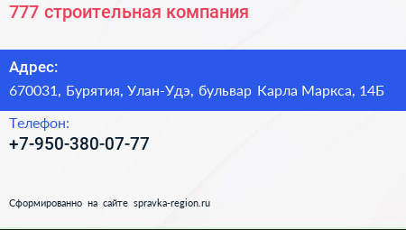 777, строительная компания по адресу 670031, Бурятия, Улан-Удэ, бульвар Карла Маркса, 14Б в дальнейшем Организация, размещена в следующих категориях: