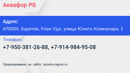 Аквафор-РБ по адресу 670024, Бурятия, Улан-Удэ, улица Юного Коммунара, 1 в дальнейшем Организация, размещена в следующих категориях: