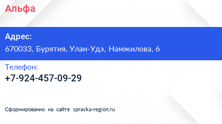 Альфа по адресу 670033, Бурятия, Улан-Удэ, Намжилова, 6 в дальнейшем Организация, размещена в следующих категориях: