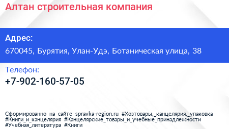 Алтан, строительная компания по адресу 670045, Бурятия, Улан-Удэ, Ботаническая улица, 38 в дальнейшем Организация, размещена в следующих категориях: