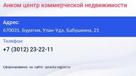 Анком, центр коммерческой недвижимости по адресу 670031, Бурятия, Улан-Удэ, Бабушкина, 21 в дальнейшем Организация, размещена в следующих категориях: