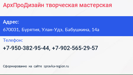 АрхПроДизайн, творческая мастерская по адресу 670031, Бурятия, Улан-Удэ, Бабушкина, 14а в дальнейшем Организация, размещена в следующих категориях: